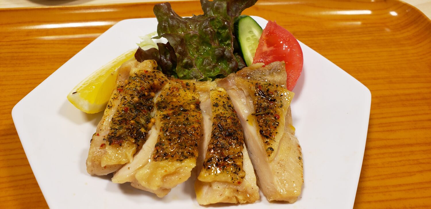 メグスパ食堂では メグスパ定食の「ハーブチキン」が人気です。